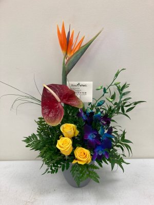 Looks good, like all the listed plants and flowers are in the arrangement. Doesn't look as symmetrical or balanced as the picture online.(birds of paradise is taller than rest of bouquet)