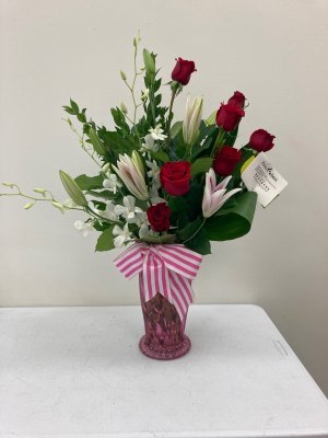 Thank you, Thank You!! The flowers were EXACTLY as shown!! Plus even more stunning. I will always use your floral shop! The quality is fantastic and my phone service was superb .... Holly helped me and she was delightful and helpful ... I switched out the red roses to a light pink rose as this is for a baby girl shower! Perfect! Everyone is oohing and awwing about these gorgeous flowers! Thank you so very much!