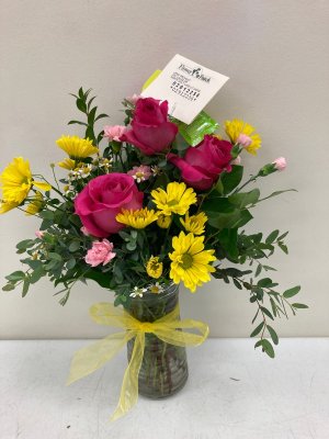 This is the first bouquet from Flower Patch that didn't knock my socks off. The bow looks haphazard and the arrangement doesn't look as full and bright as the website photo. It will do.