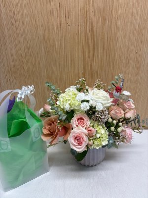 the arrangement is pretty but falsely advertised based on what is pictured on their website. The amount of flowers seems limited and small in comparison and the price. This bouquet is to commemorate new life as well as tragic loss, and this is disappointing. I'll will not order from this company again.