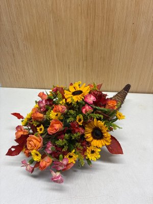 Very nice floral table centerpiece, in a cornucopia for Thanksgiving. Thank you!