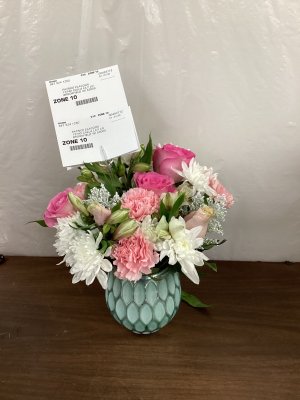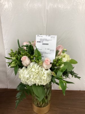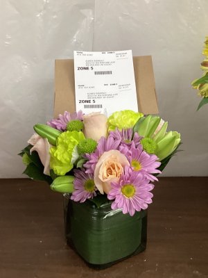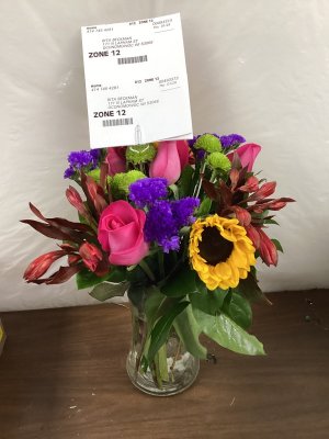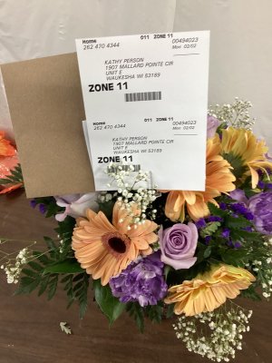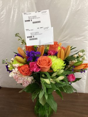 I was thoroughly delighted with the gorgeous flower arrangement that I recently received. The flowers were fresh and beautiful and in my favorite colors. Thank you!!!!