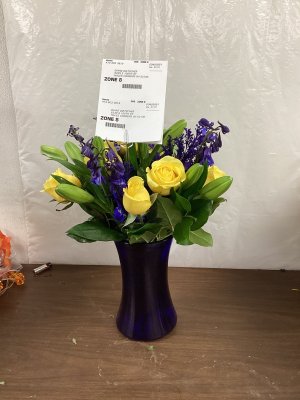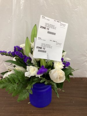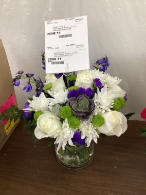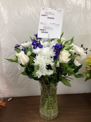 Beautiful flower arrangement. I love the white and blue together. Made my day!