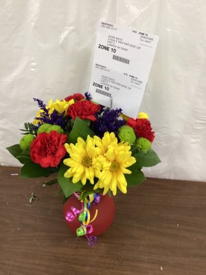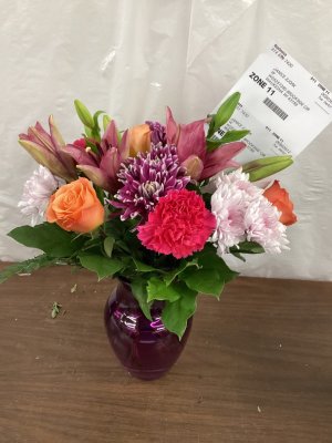 The flower arrangement was beautiful! Loved the colorful combination of roses, iris, lavender, daisies, and mums๐ The pitcher glass vase was very attractive! Loved itโค๏ธ