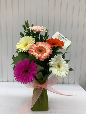 Beautiful floral arrangement was delivered on time and just as pictured on the website. Customer service was very helpful with a last minute change.