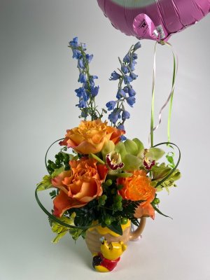 Very pretty! The flowers look fresh and the bear is very cute! (I don't particularly like the balloon design with the bottles, but it's okay.) What a great idea to send a photo of what was actually delivered. The person taking the order was so nice, very cheerful and helpful. Thank you! Note: I am unable to click on the stars for some reason, but I would give five stars!