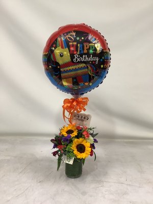 They are so beautiful always perfect coming from McShan. My planter had the little stand, but not a balloon. The flower selection is perfect because they will last for a while. Love it!