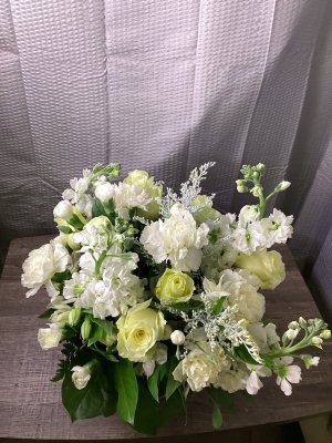 I sent the arrangement to Polly. I am disappointed with it, all of the flowers appear to be smashed down. Not very flattering.