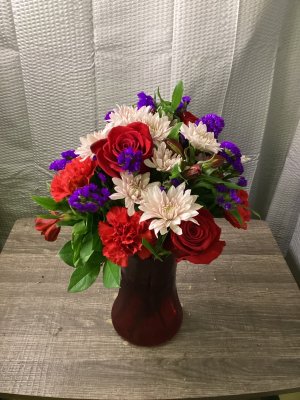 The arrangement is lovely, and I love the vase! The flowers were even more special because they were from my grands!