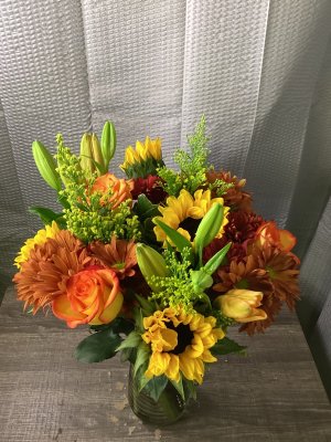 The arrangement is lovely, and I love the vase! The flowers were even more special because they were from my grands!