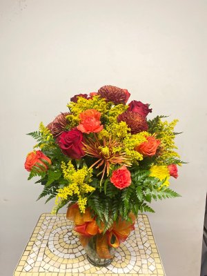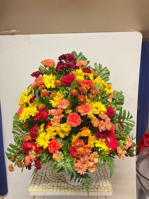 I like the color palette of the flowers, although seems like there's a lot of mums & daisies. Would have preferred more roses or other flowers. It is a big, beautiful arrangement.