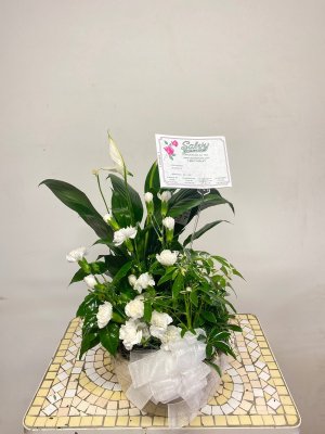 I am sorry to say that I am not happy with this arrangement. I specifically chose a plant without flowers and one that looked much more lively. This one that got delivered looks a bit sad and has white flowers. Can you please advise on what options we have to right this situation? I honestly don't want anything else delivered to disturb the family but perhaps a refund. Thanks for understanding.