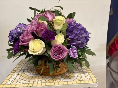 It is a lovely arrangement. I do like it in the vase ( thought it was going to be in a basket). The vase gives it nice height. I am very happy with the presentation. It is beautiful. Thank you.