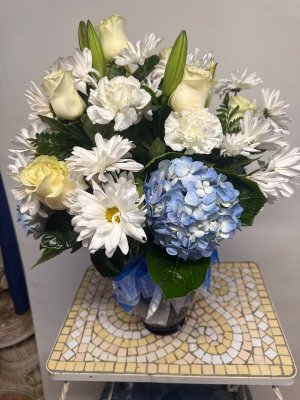 Flowers were very pretty. My son really liked them. The photo you sent really helped since I did not get to see them in person. It was made and delivered in just a couple hours. I was really surprised. Thank you for an exceptional job!!