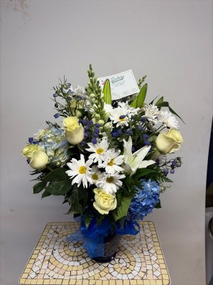 Beautiful, thank you. Just wish I could see what the arrangement is in…maybe a couple pictures from different angles but I will definitely order from you again! ❤️