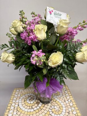 Great folks to work with, offered options for the arrangement, same day delivery, and provided photo. I have to say the overpowering filler of large green leaves definitely took away from beauty of the yellow roses. It was too much. I wish that could have been changed. However, I would order from Salvy's again.